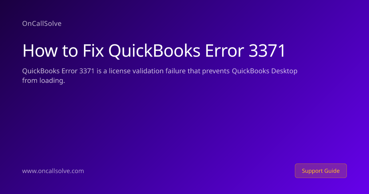 QuickBooks Error 3371 is a license validation failure that prevents QuickBooks Desktop from loading. The error appears with the message "QuickBooks could not load the license data. This may be caused by missing or damaged files." It surfaces most often when launching QuickBooks after a Windows migration, a hard drive clone, or a system reinstall. This guide covers every fix verified on QuickBooks Desktop 2022 through 2026 on Windows 10 and Windows 11. Error 3371 does not affect QuickBooks Online or Mac versions; it is a Windows-only issue tied to local license file storage.