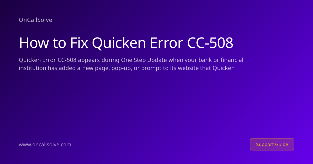 Quicken Error CC-508 appears during One Step Update when your bank or financial institution has added a new page, pop-up, or prompt to its website that Quicken cannot navigate automatically. The error halts transaction downloads and leaves your accounts out of sync until you clear the interruption manually. This guide walks through every verified fix for CC-508 on Quicken Classic for Windows 2024 and 2025, tested on Windows 10 and Windows 11, from a simple browser cleanup to deactivating and reactivating your bank connection.